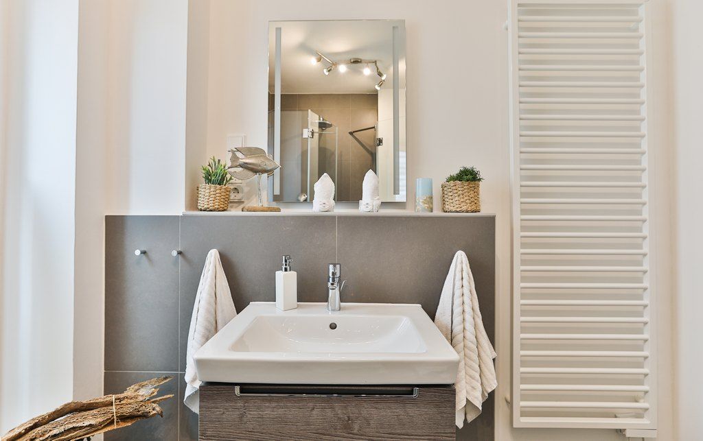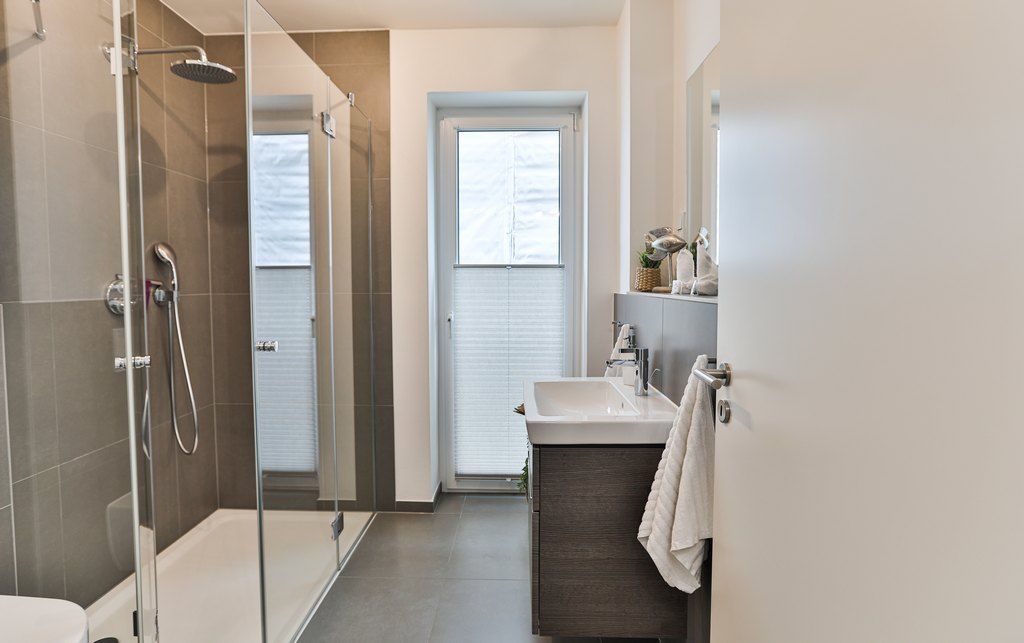 Badezimmer mit ebenerdiger Dusche, Kosmetikspiegel und Fön.