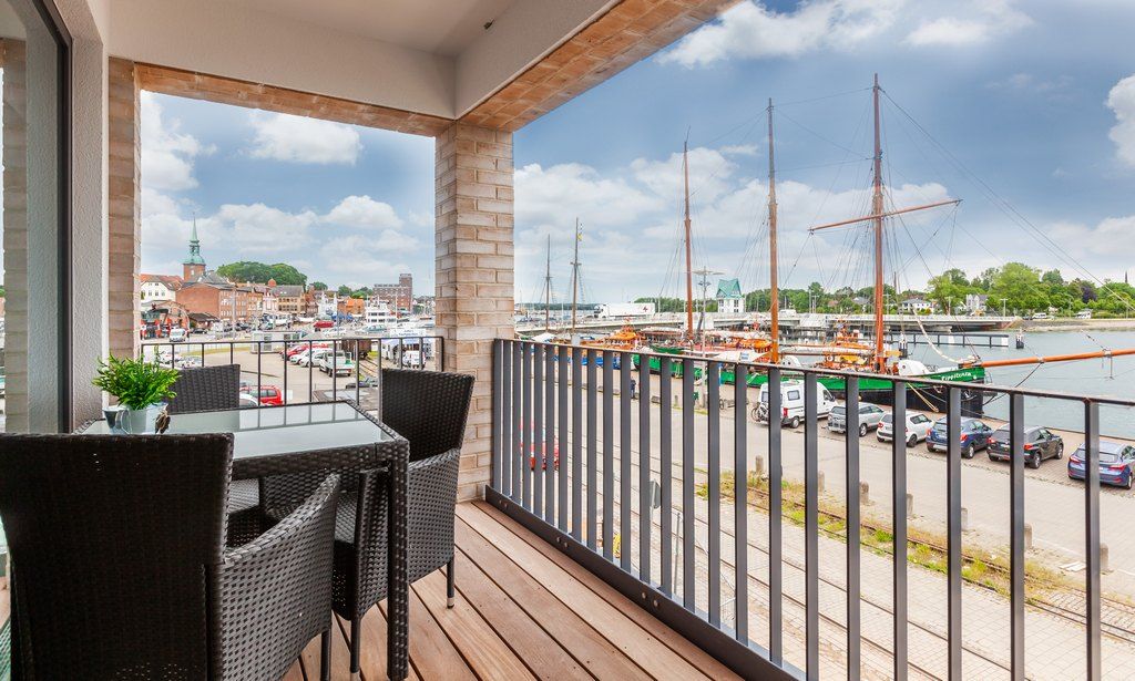 Ein Balkon mit Gartenmöbeln, Elektrogrill und Blick auf die Schlei und Schleibrücke.