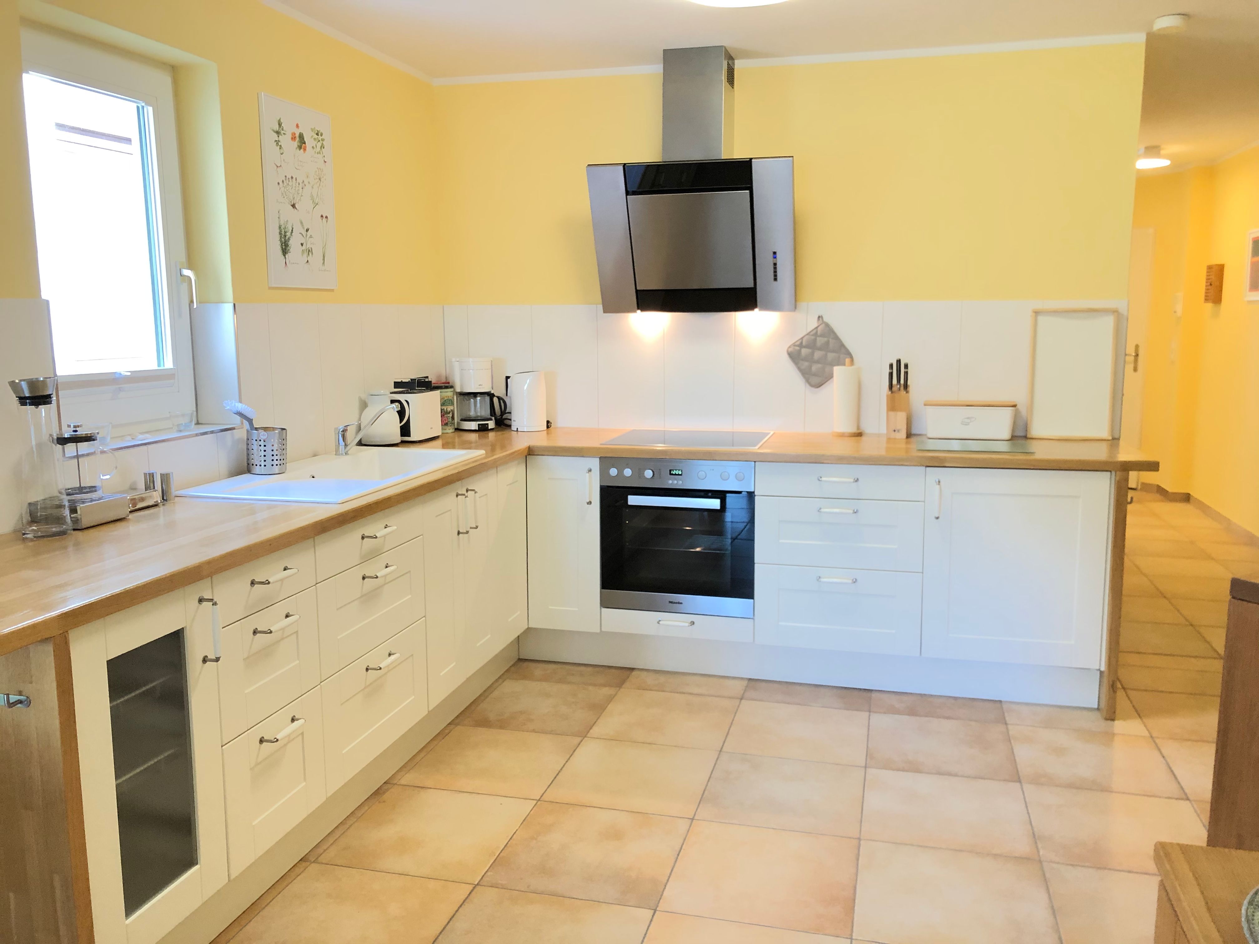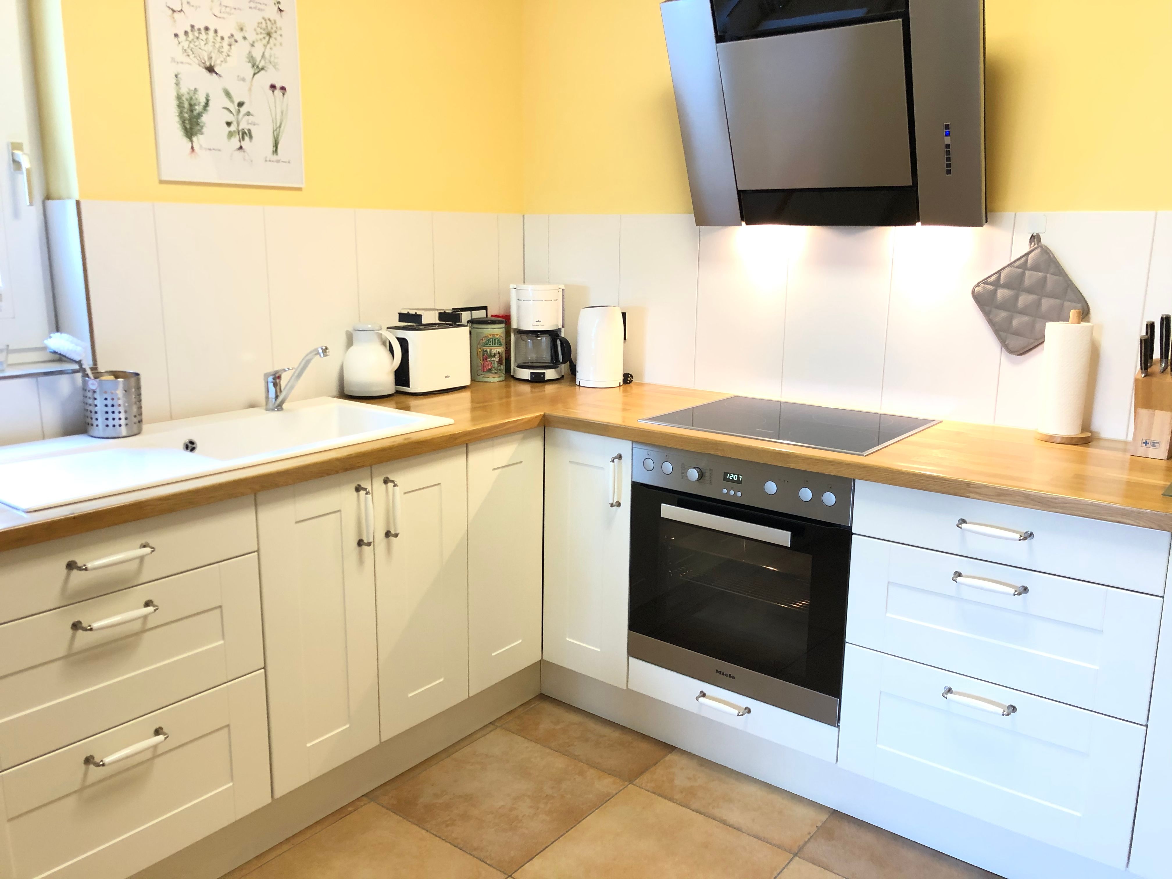 Offene, voll ausgestattete Küche mit Kühlschrank, Geschirrspüler, Induktionskochfeld. Backofen, Dunstabzugshaube, Toaster, Mixer, Wasserkocher und Kaffeemaschine.