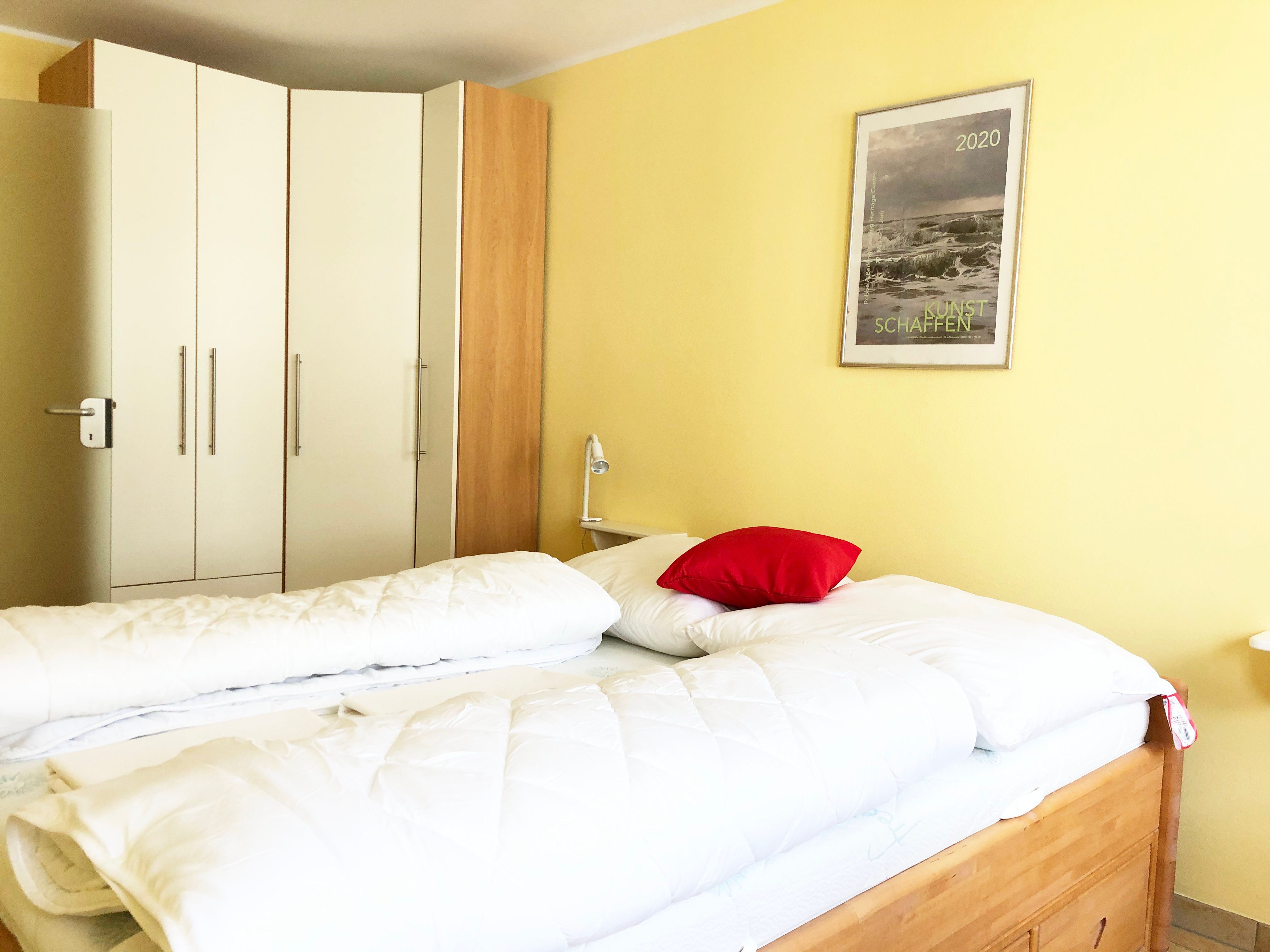 Schlafzimmer mit Doppelbett (2x 80x200 cm), verstellbarem Lattenrost und Kleiderschrank.