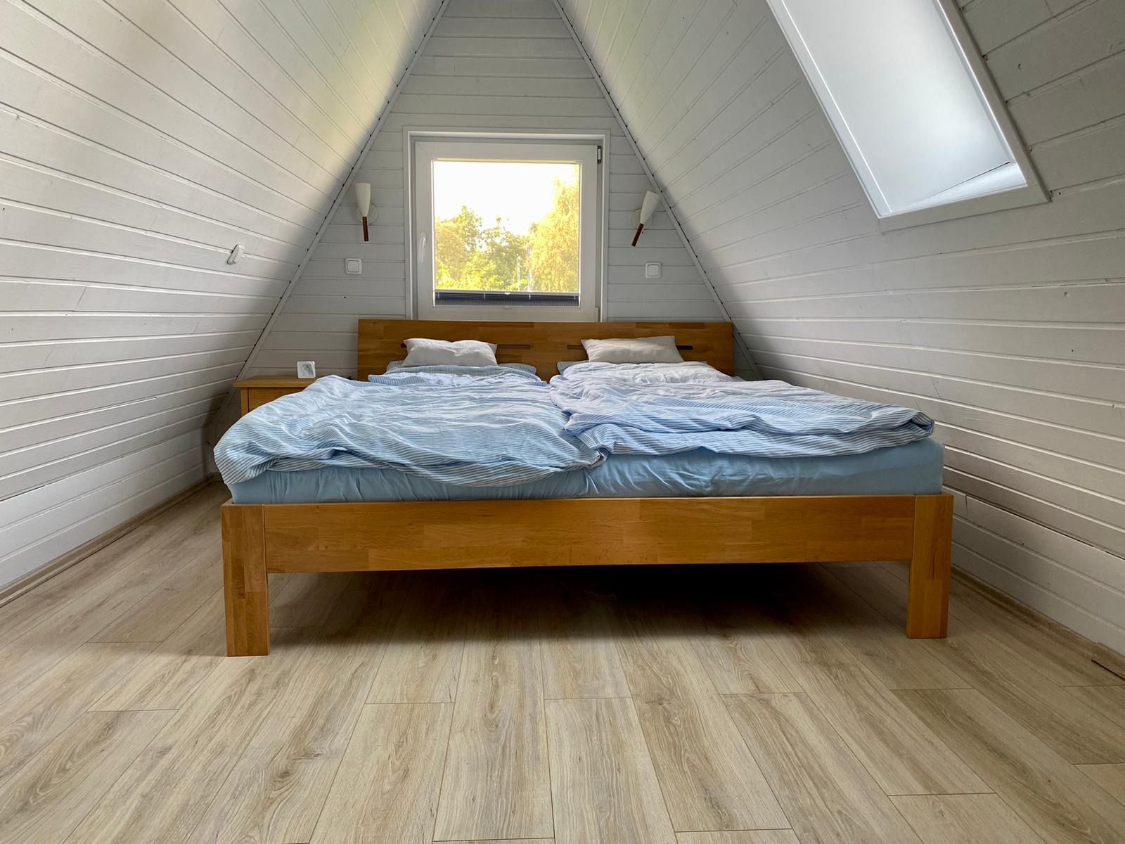 Schlafzimmer OG: Doppelbett (180x200 cm), Kleiderschrank, Fliegengitter und Verdunklungsmöglichkeit.