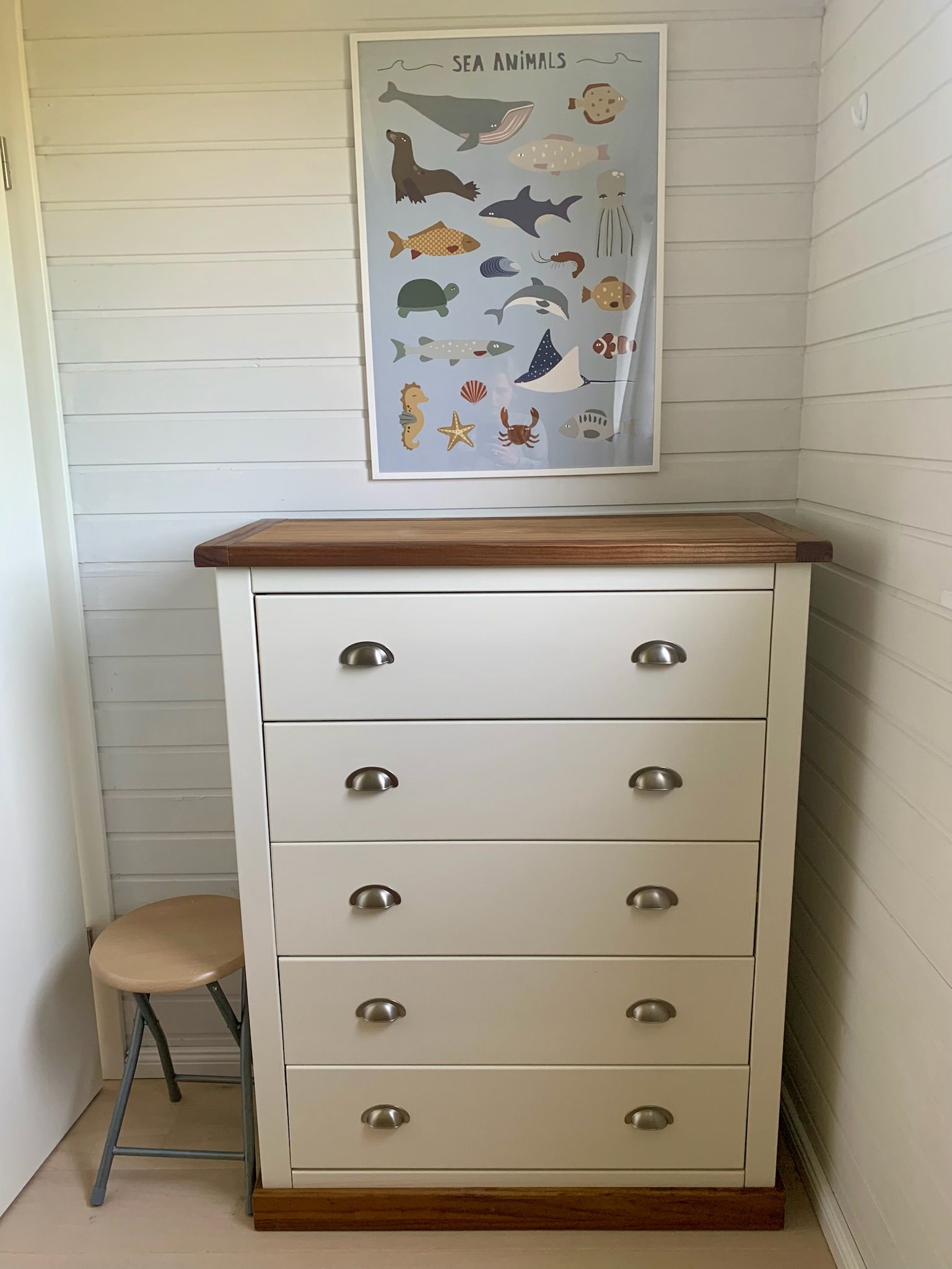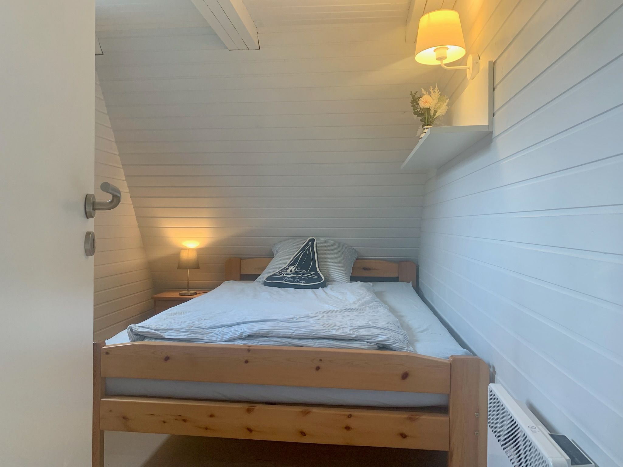 Schlafzimmer EG: kleines Doppelbett (140x200 cm), große Kommode, Fliegengitter und Verdunklungsmöglichkeit.