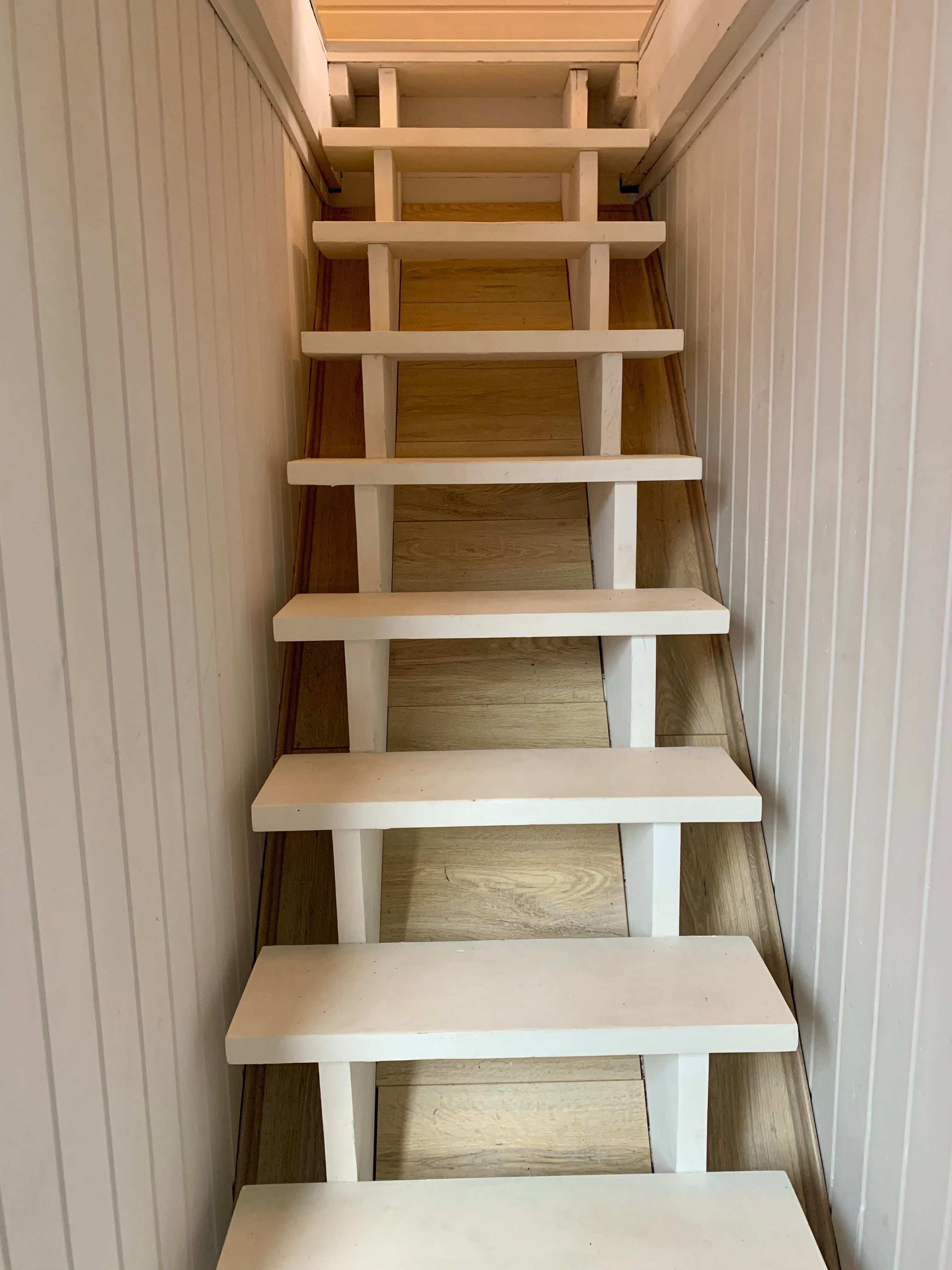 Ins Obergeschoss führt eine Raumspartreppe ohne Geländer.