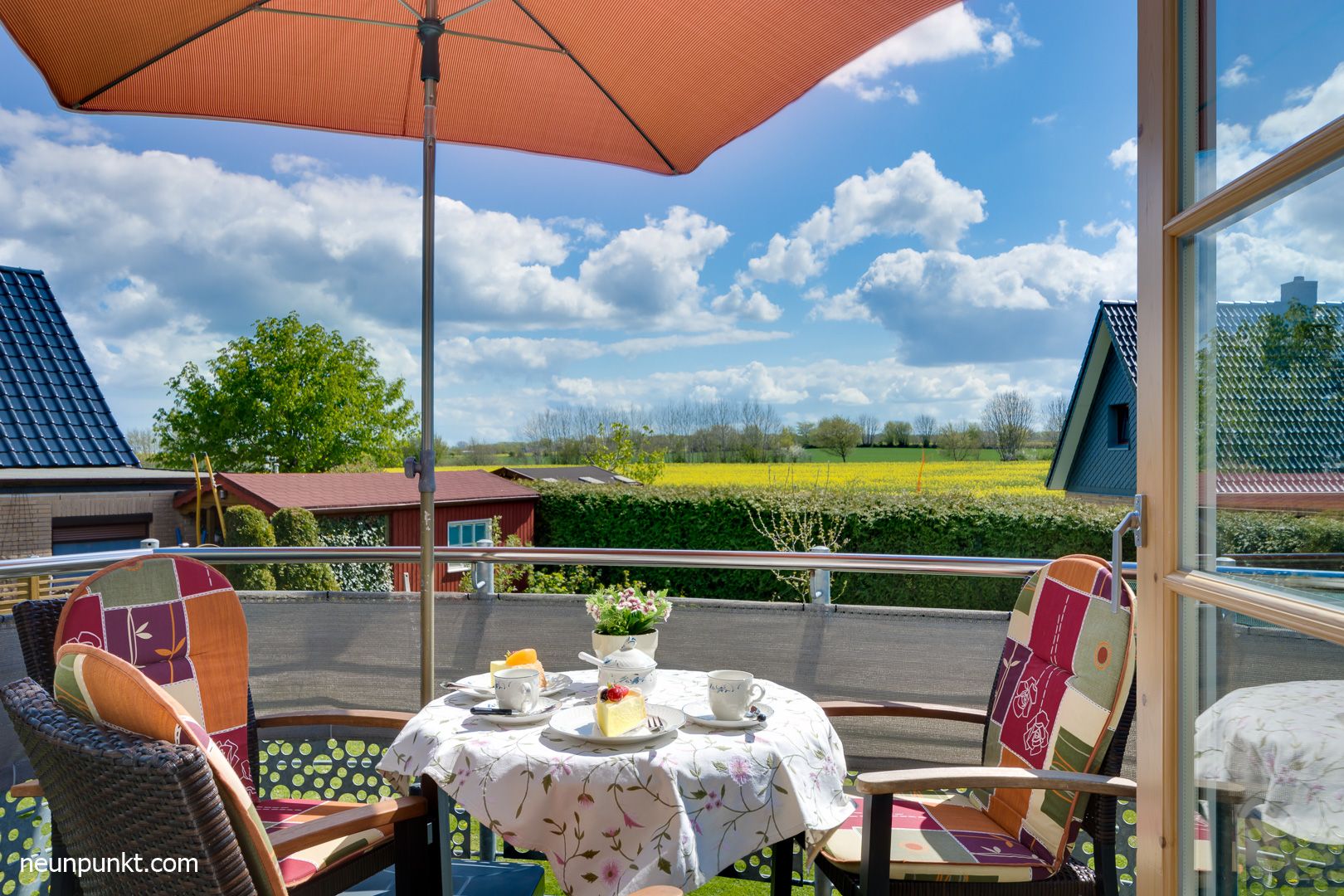 Ein sonniger Balkon mit Gartenmöbeln und Blick in die Ferne.