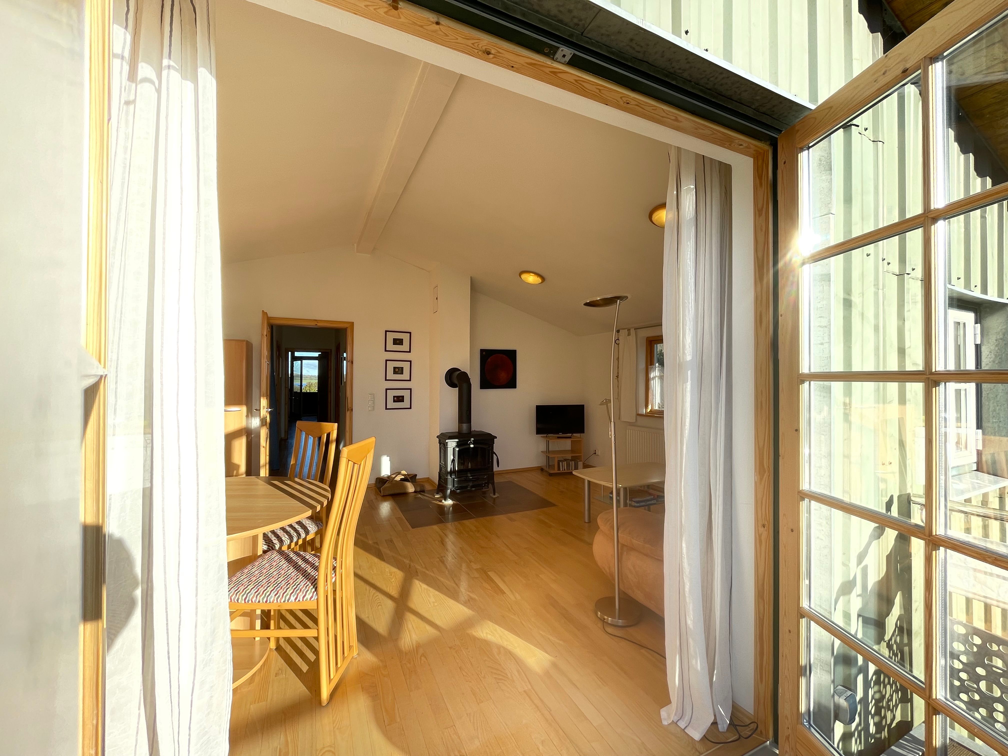 Integrierter Wohn- und Essraum mit Kaminofen.
