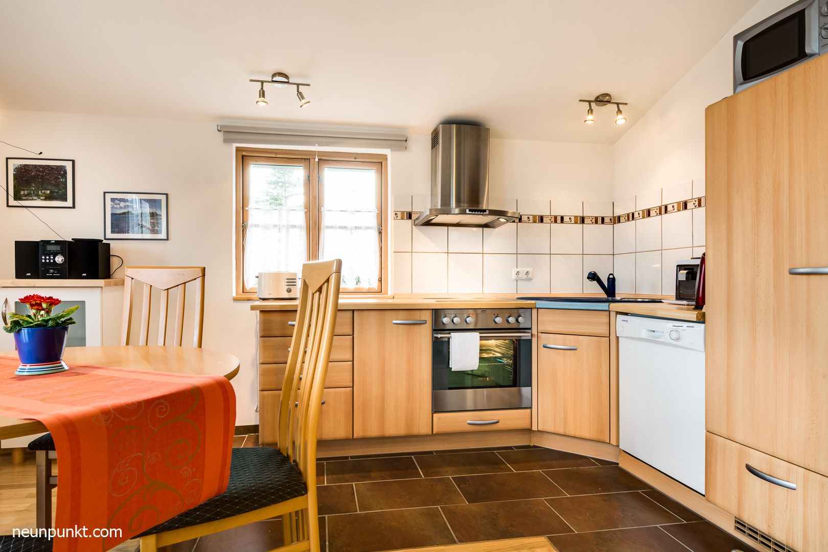 Offene Küche mit E-Herd, Backofen, Kühlschrank und Geschirrspüler, Kaffee-Padmaschine.