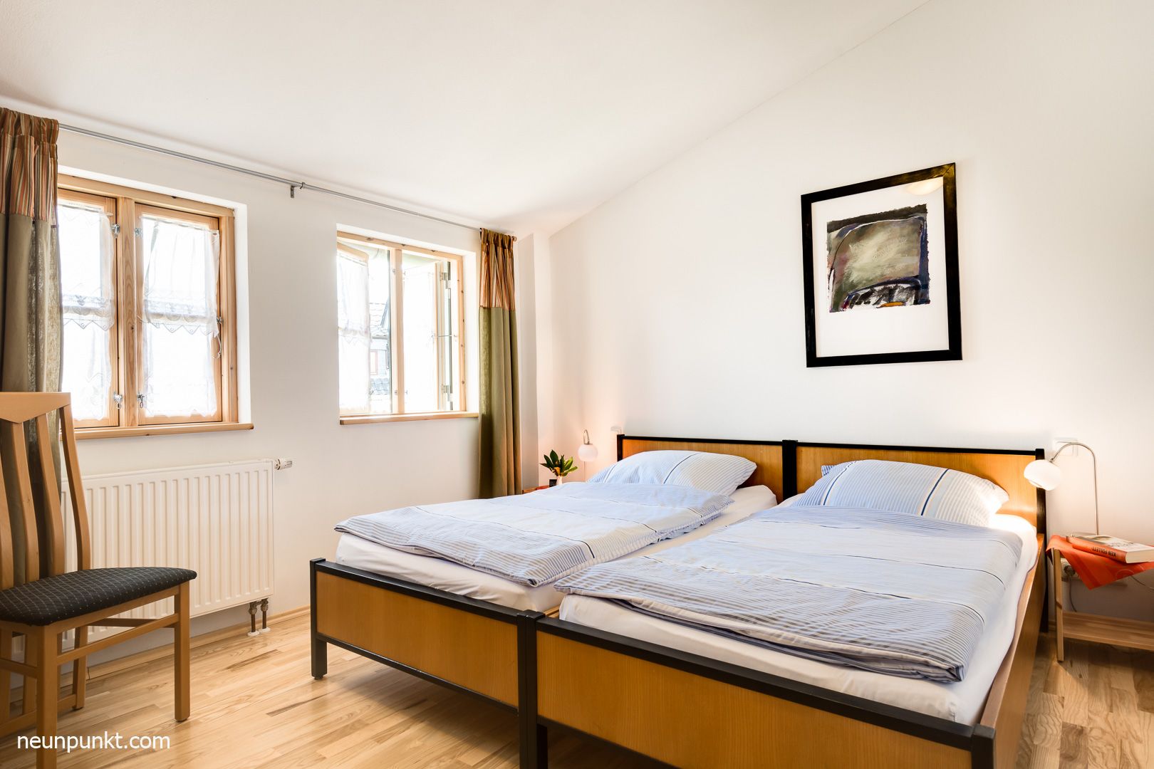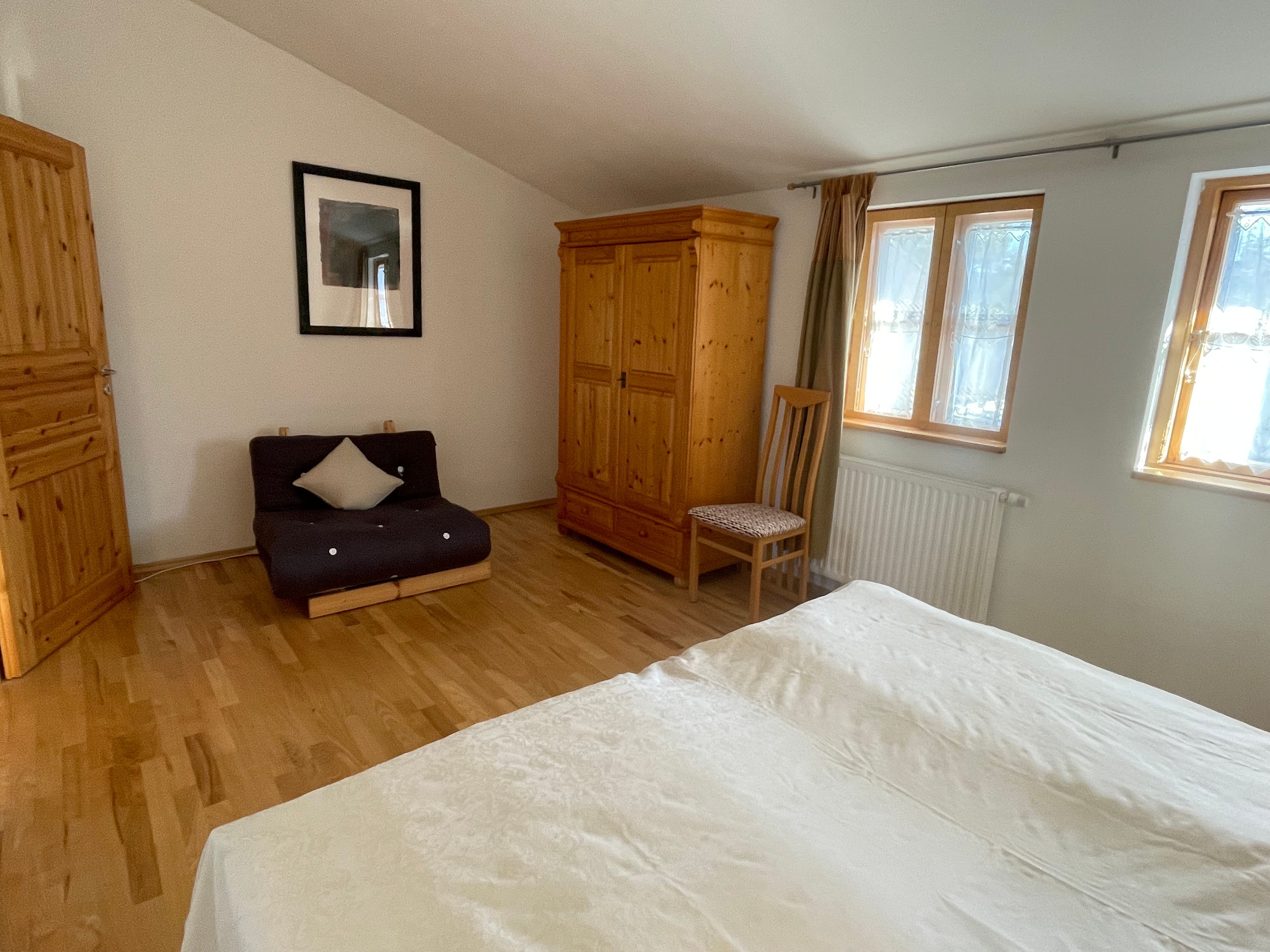 Ein Doppel-Schlafzimmer (2x 100x200 cm) mit einem zusätzlichem Futonsessel, der sich zu einem Bett umfunktionieren lässt.