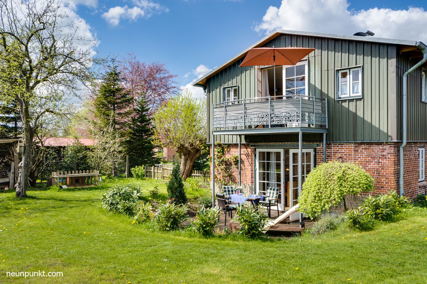 Das großzügige Objekt mit ruhigem Schlafzimmer, modernem Bad, großem Wohnraum mit gemütlicher Sitzecke, komplett eingerichteter Küchenzeile, TV, WLAN, Radio verfügt über einen Balkon mit Blick in den Garten.