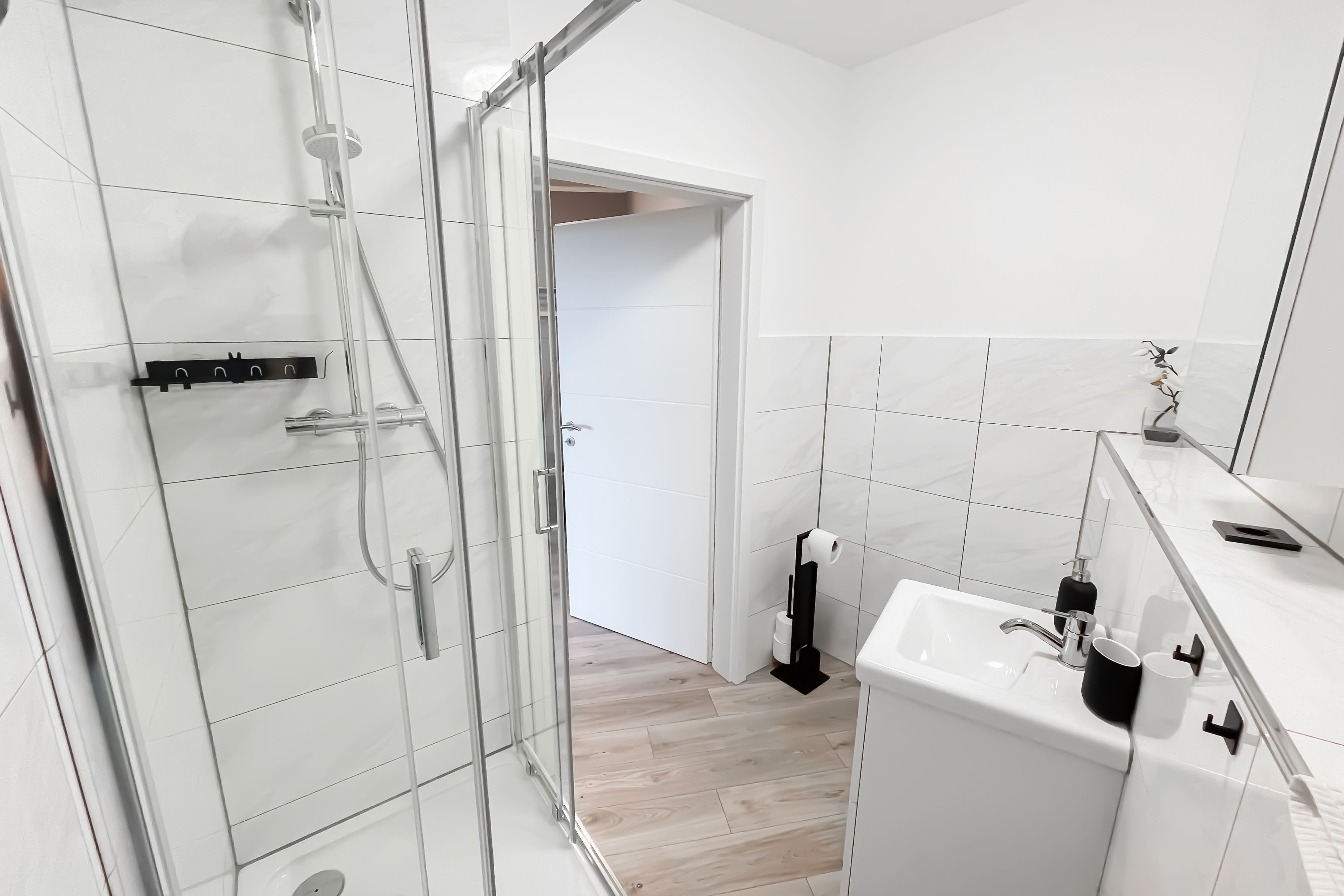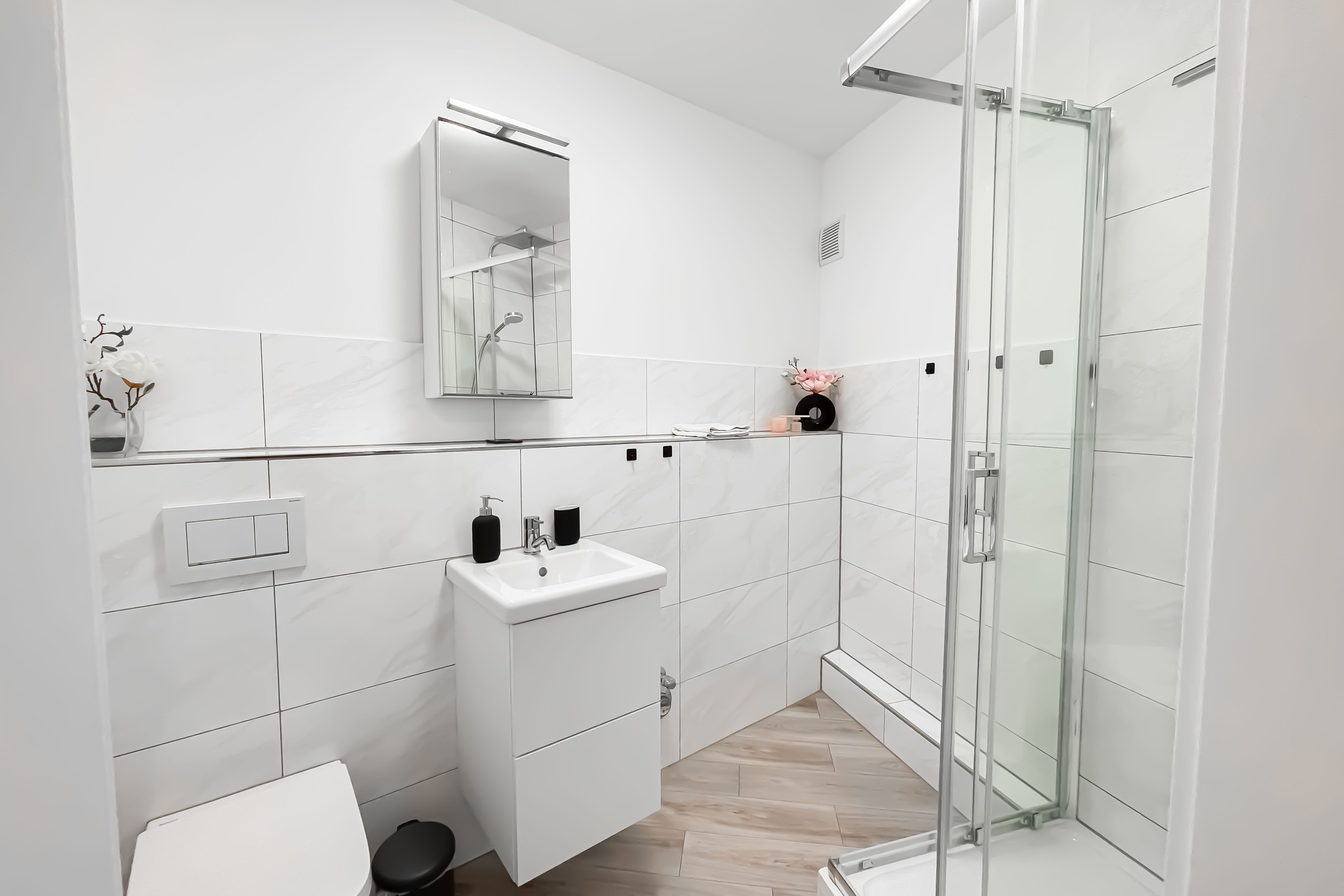 1 Badezimmer: Dusche, WC, Spiegel, Waschbecken.