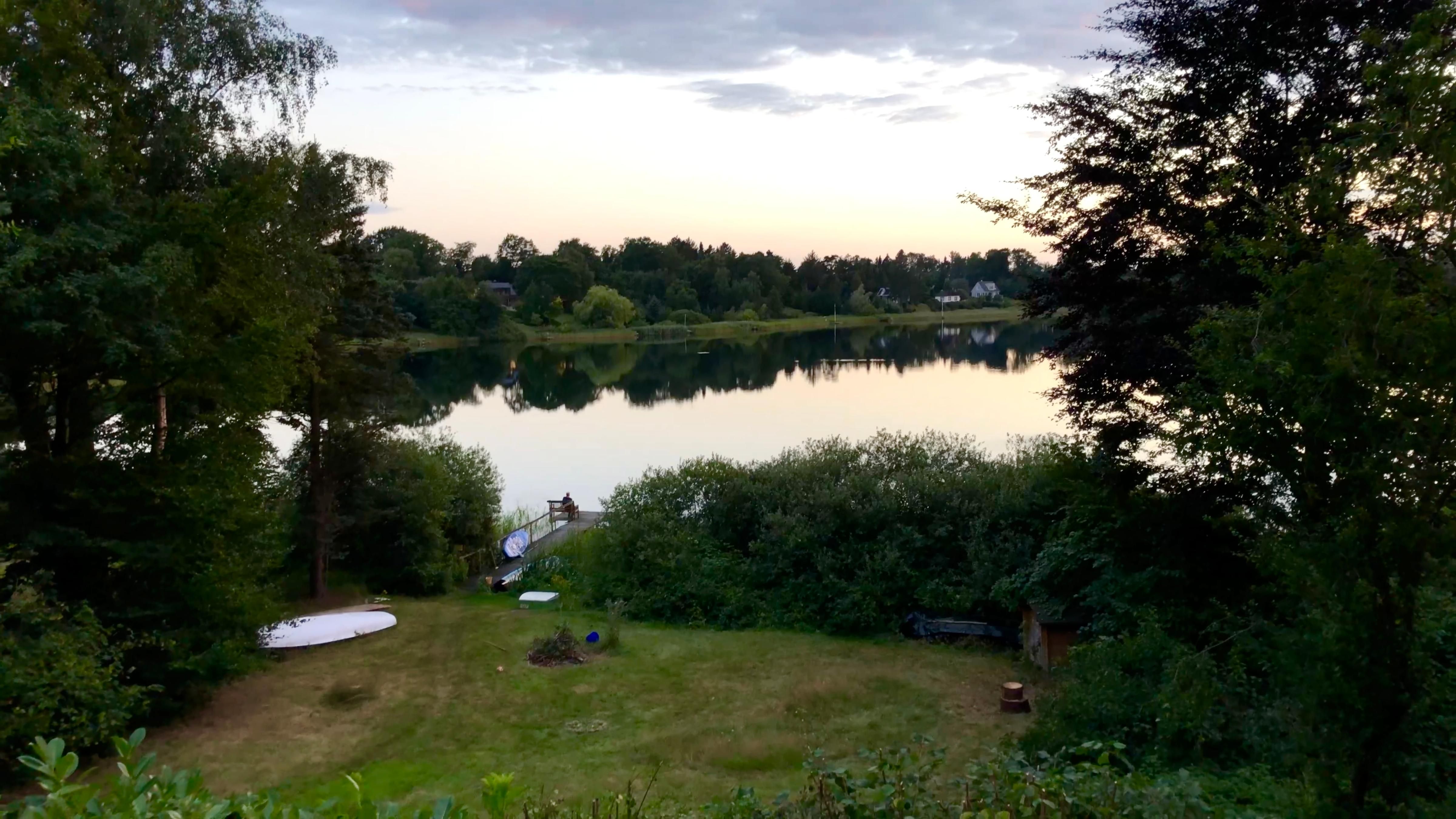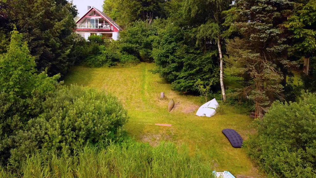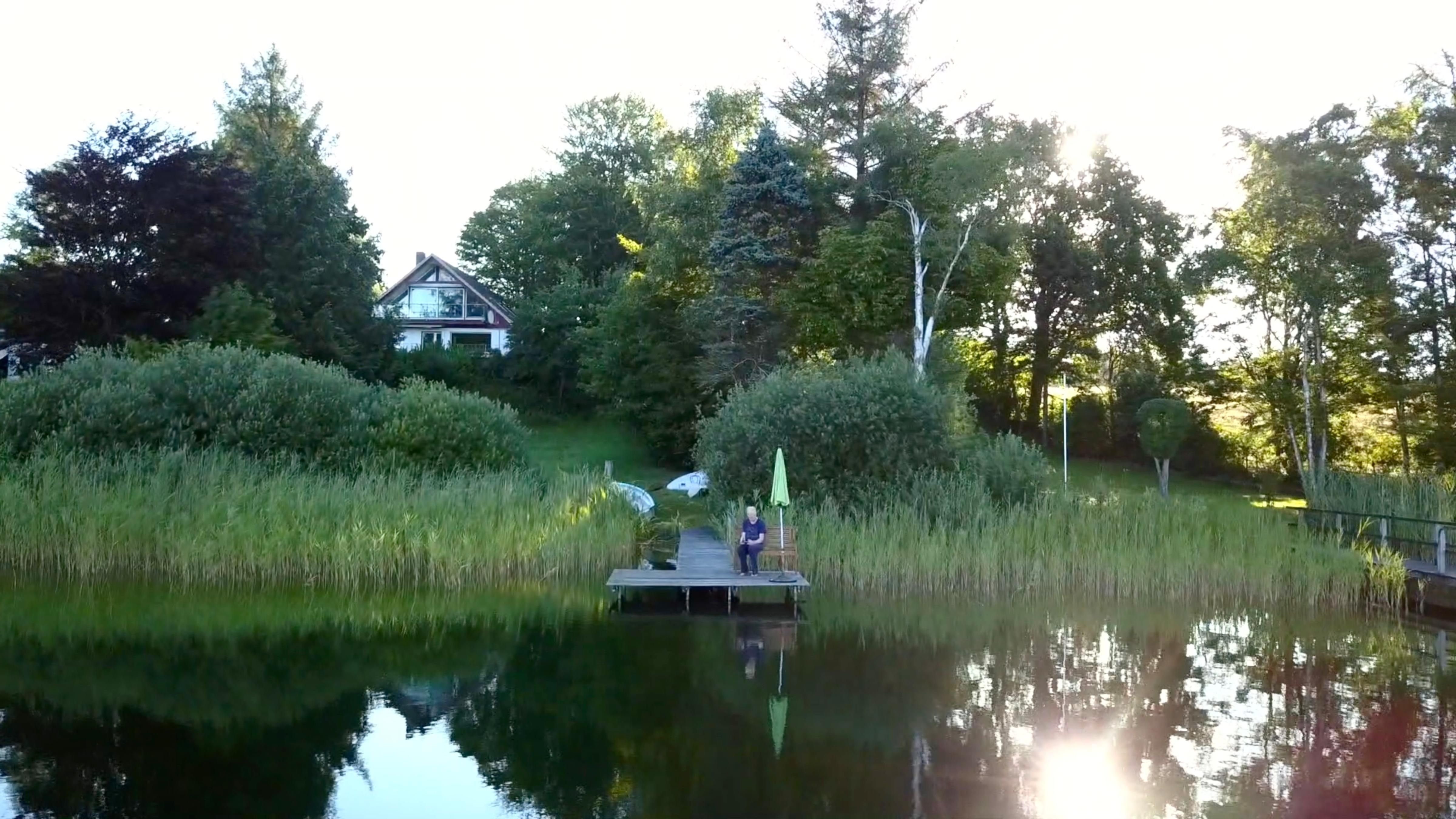 Außenanlage: Garten, Liegewiese, 2 Sonnenliegen, Gartenmöbel, Sonnenschirm, Markise, Steg mit direktem Zugang zum See (Baden auf eigene Gefahr)