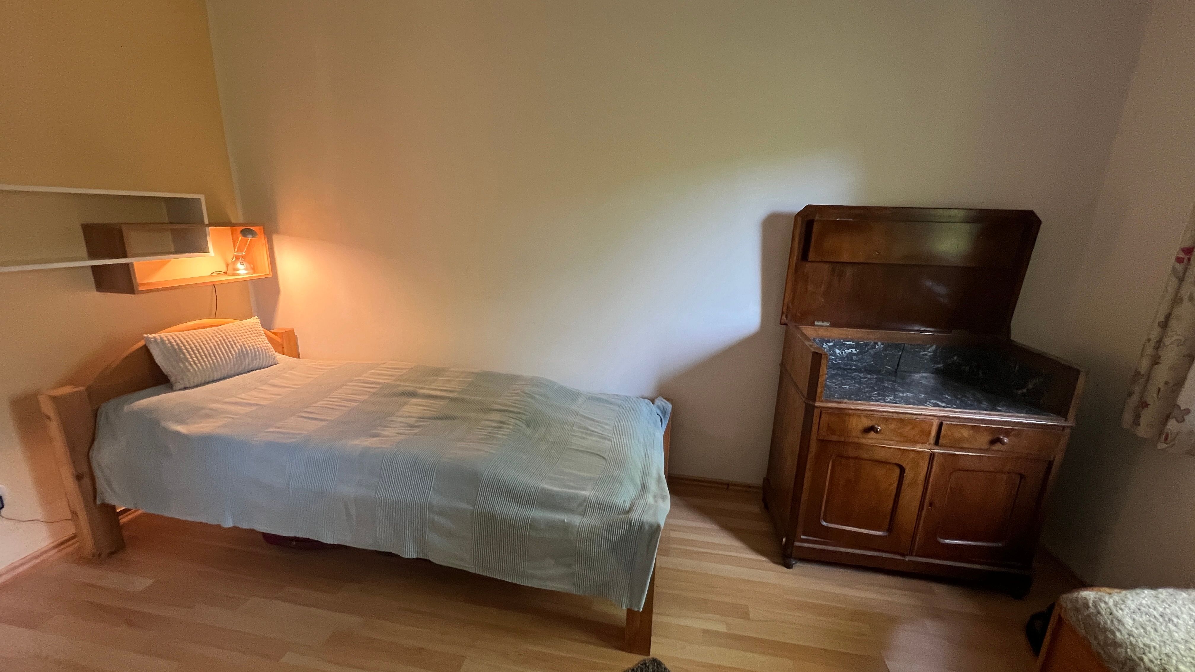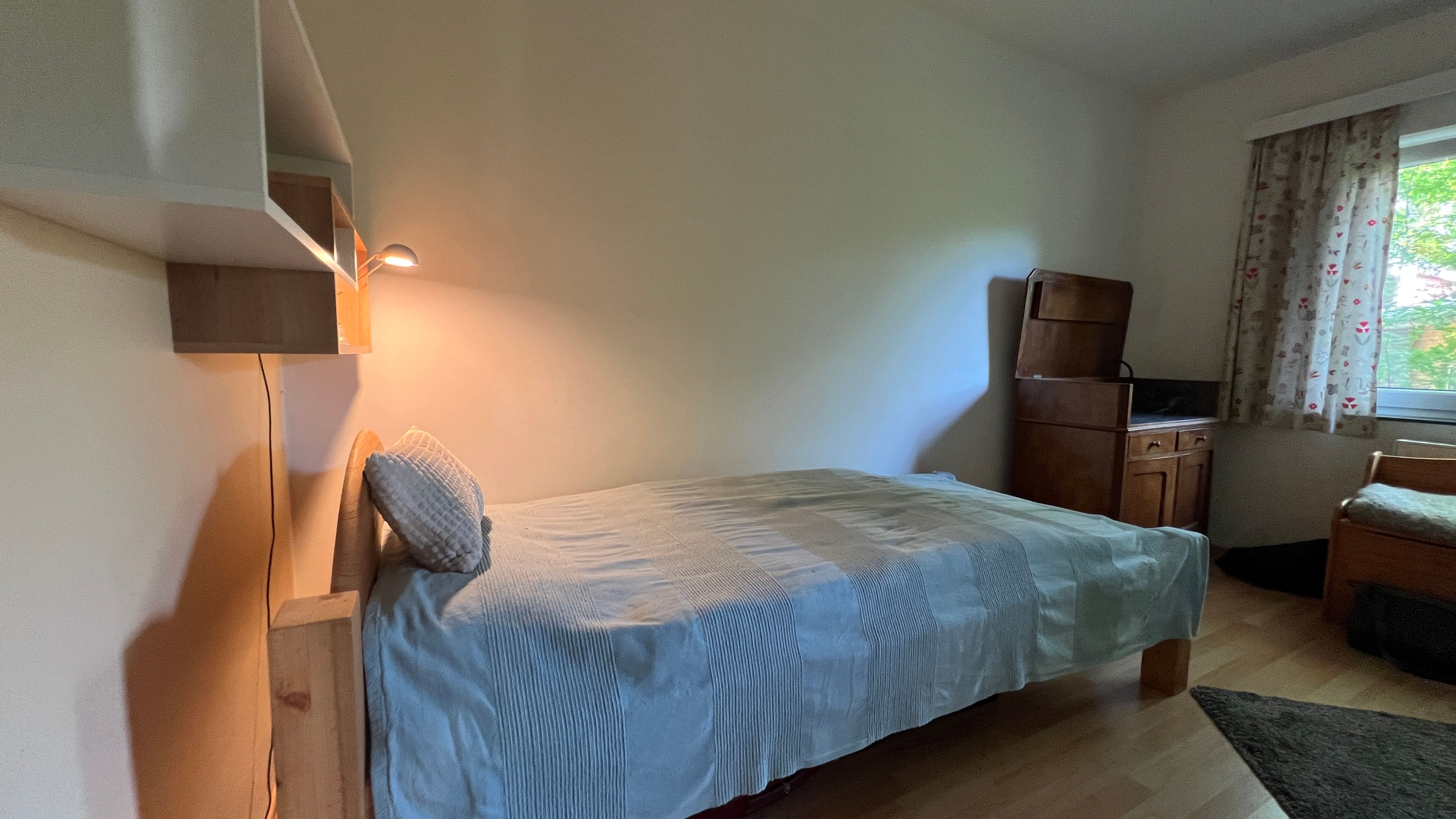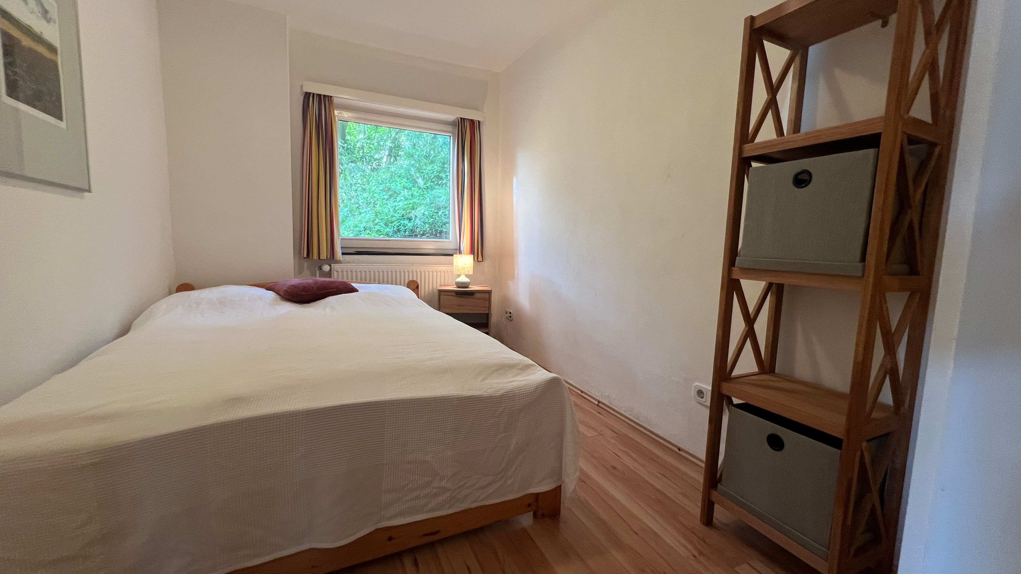 Ein Schlafzimmer mit DOB 160 x 200 (getr.Matratzen) mit einem zusätzlichem Einzelbett (90x200) - Gardinen, Kommode + offene Regale + Kleiderhaken an der Tür.