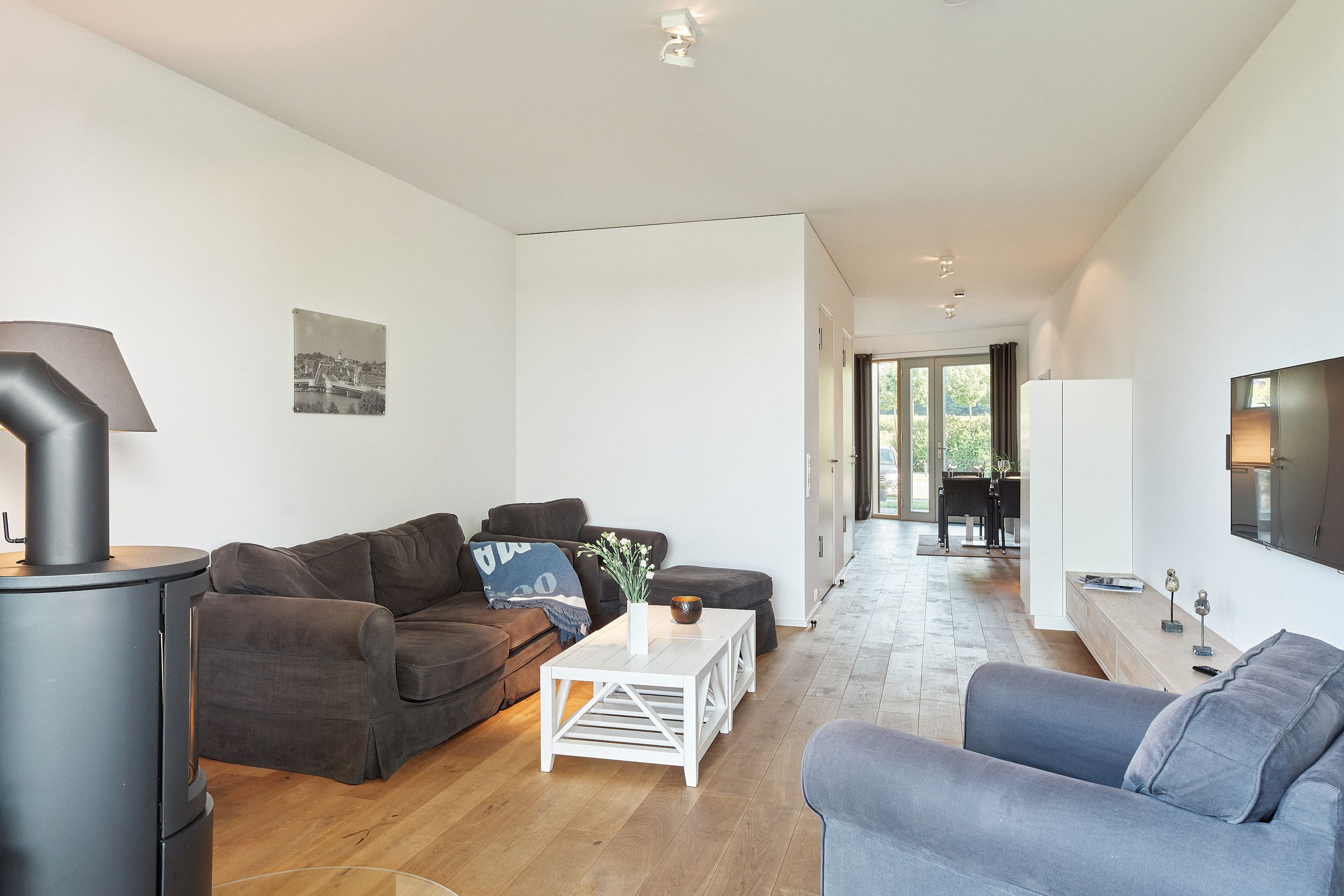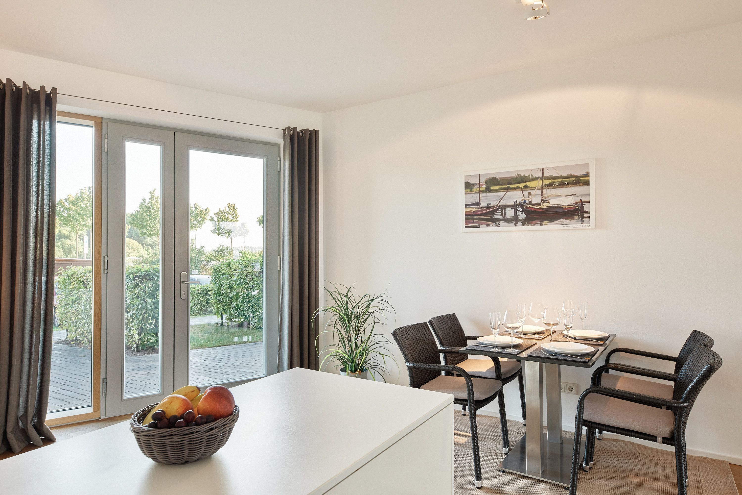 Außenbereich: möblierte Terrasse, Garten zur Gemeinschaftsnutzung, Steg mit 2 Sonnenliegen und Sonnenschirm (Gemeinschaftsnutzung), Windschutz, Elektrogrill, Fahrradschuppen mit Ladestation für E-Bikes.