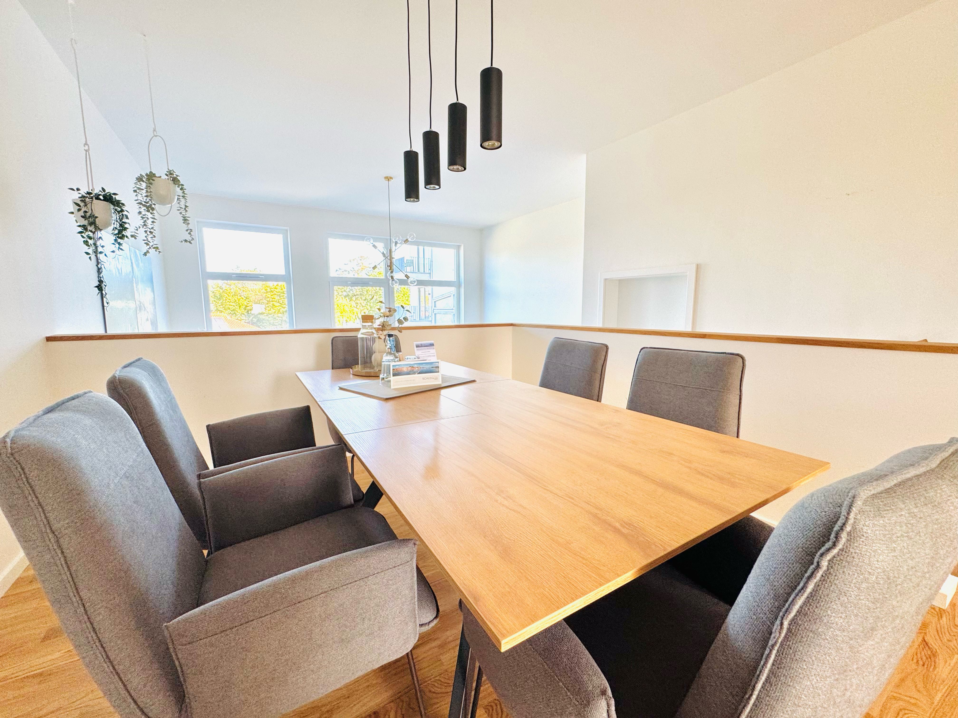 Wohn-/Essbereich: Esstisch mit 6 Stühlen, 2x 2er Sofa, Garderobe.