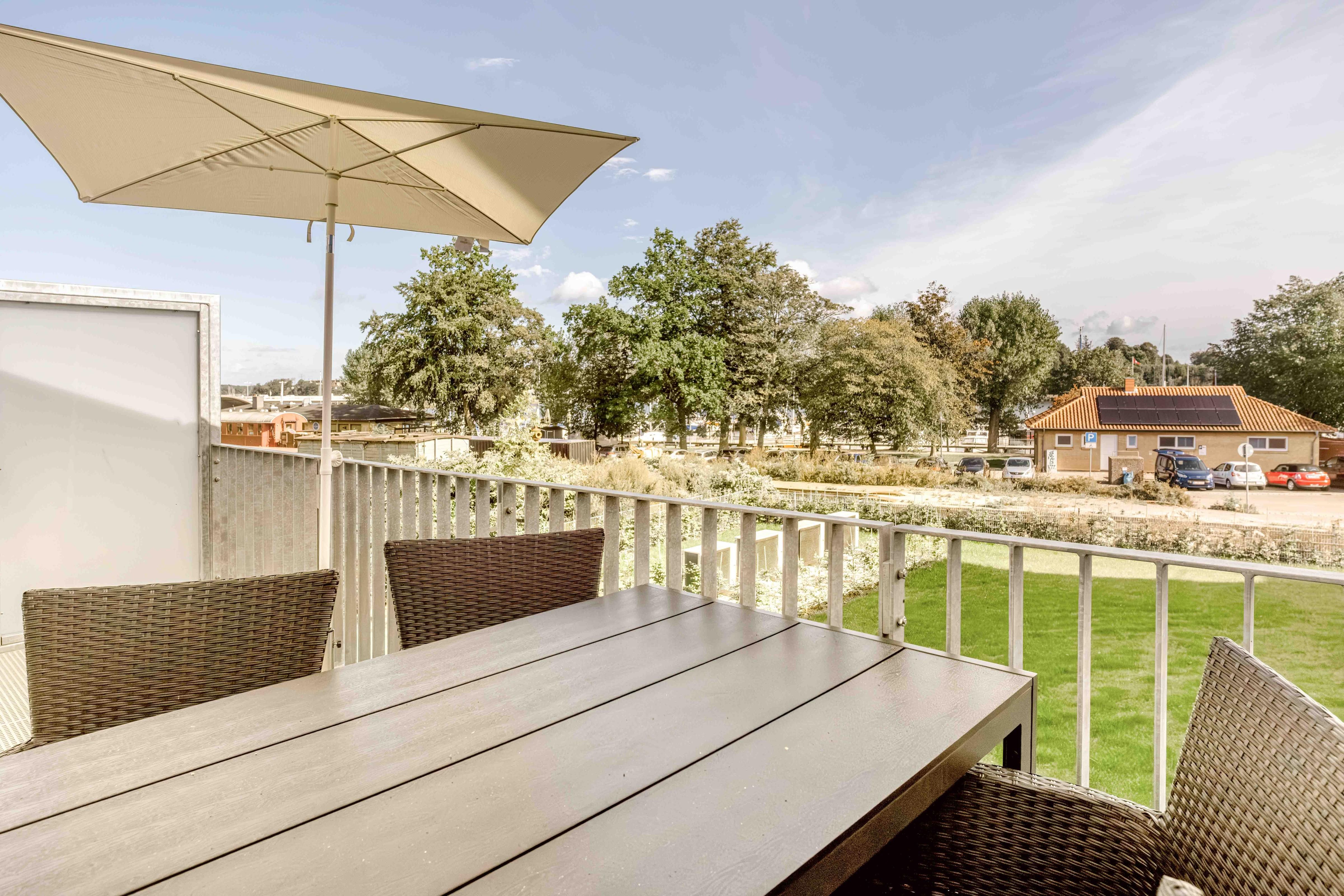Außenanlage: Gartenmöbel auf Balkon und Terrasse, Elektrogrill, Sonnenschirm.