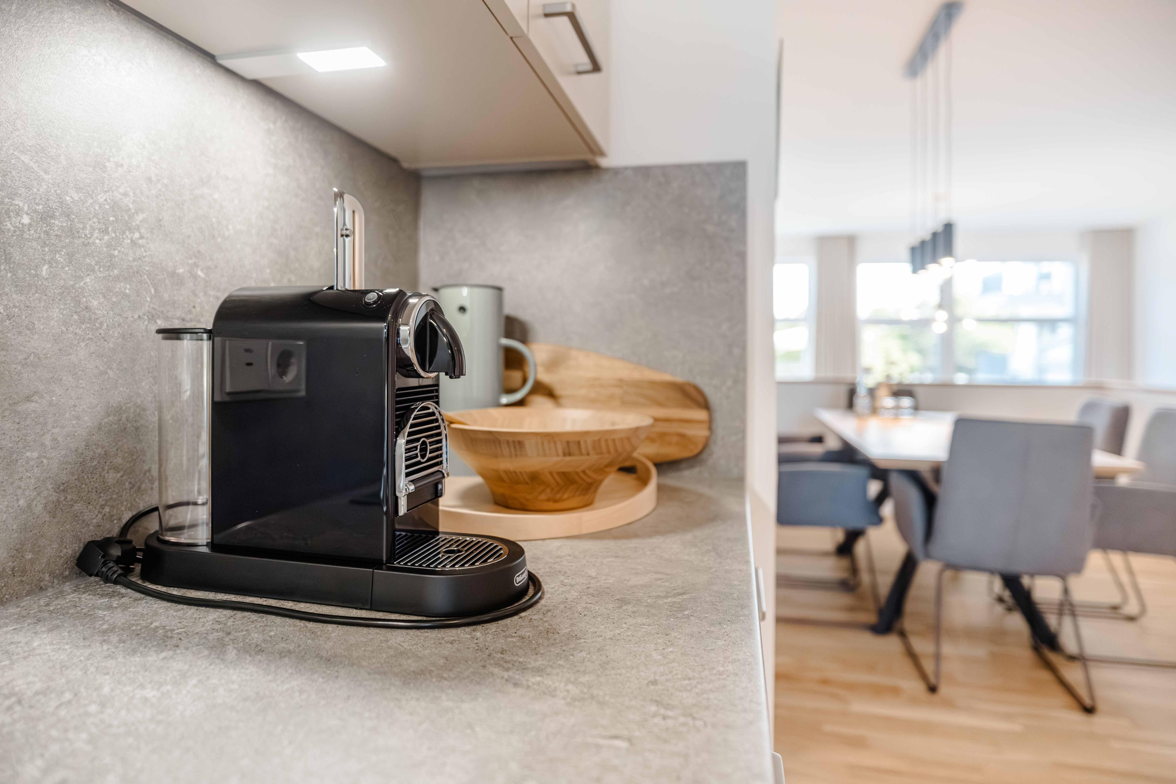 Offene Küche: Induktionskochfeld, Backofen, Kühlschrank mit Gefriermöglichkeit, Spülmaschine, Kaffeemaschine, Nespressomaschine, Wasserkocher, Toaster, Handrührgerät.