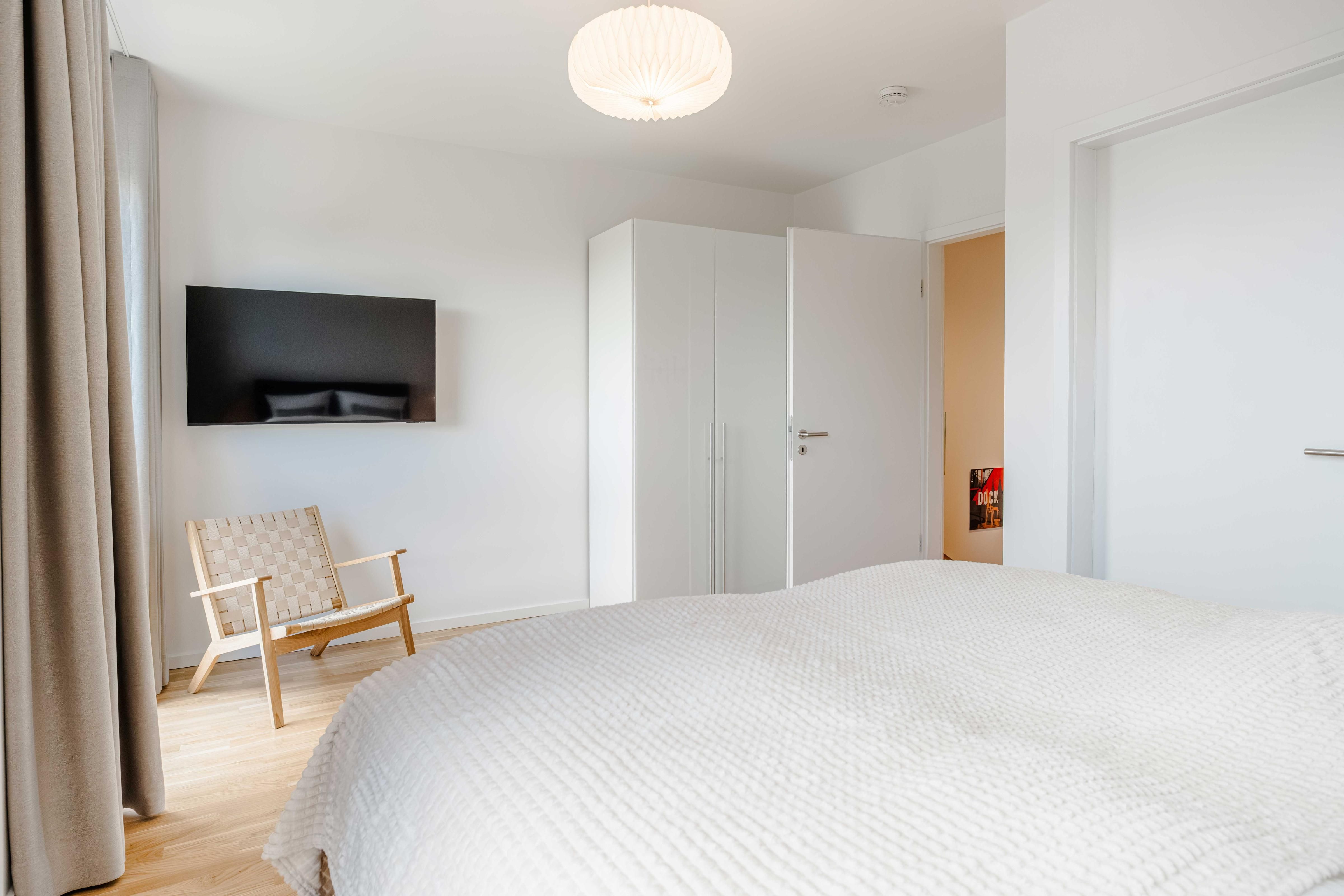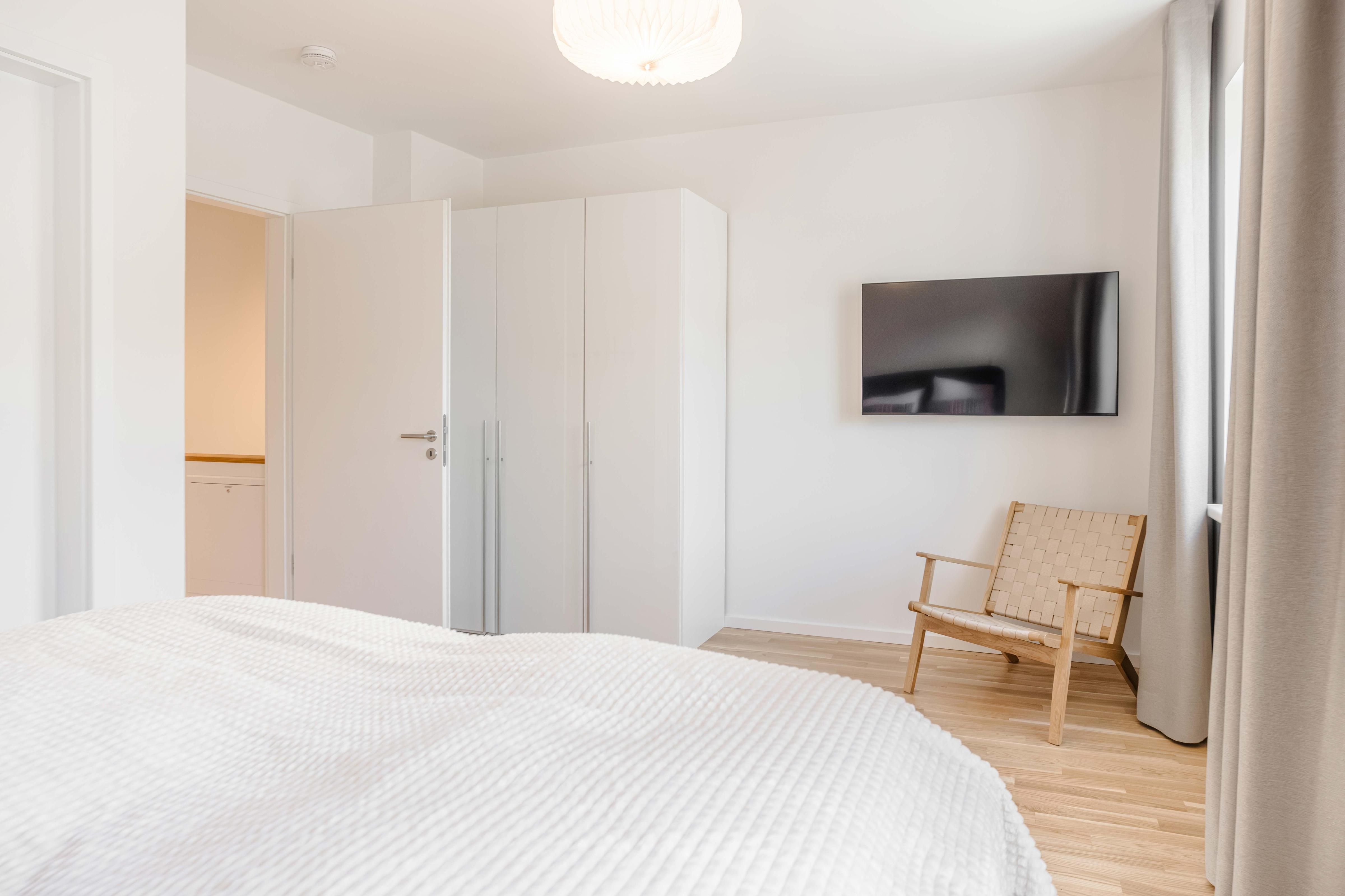 Schlafzimmer 2: Boxspringbett (160x200 cm), offenes Fußende, Kleiderschrank, Verdunklungsmöglichkeit, TV, Bad en Suite, Sessel.