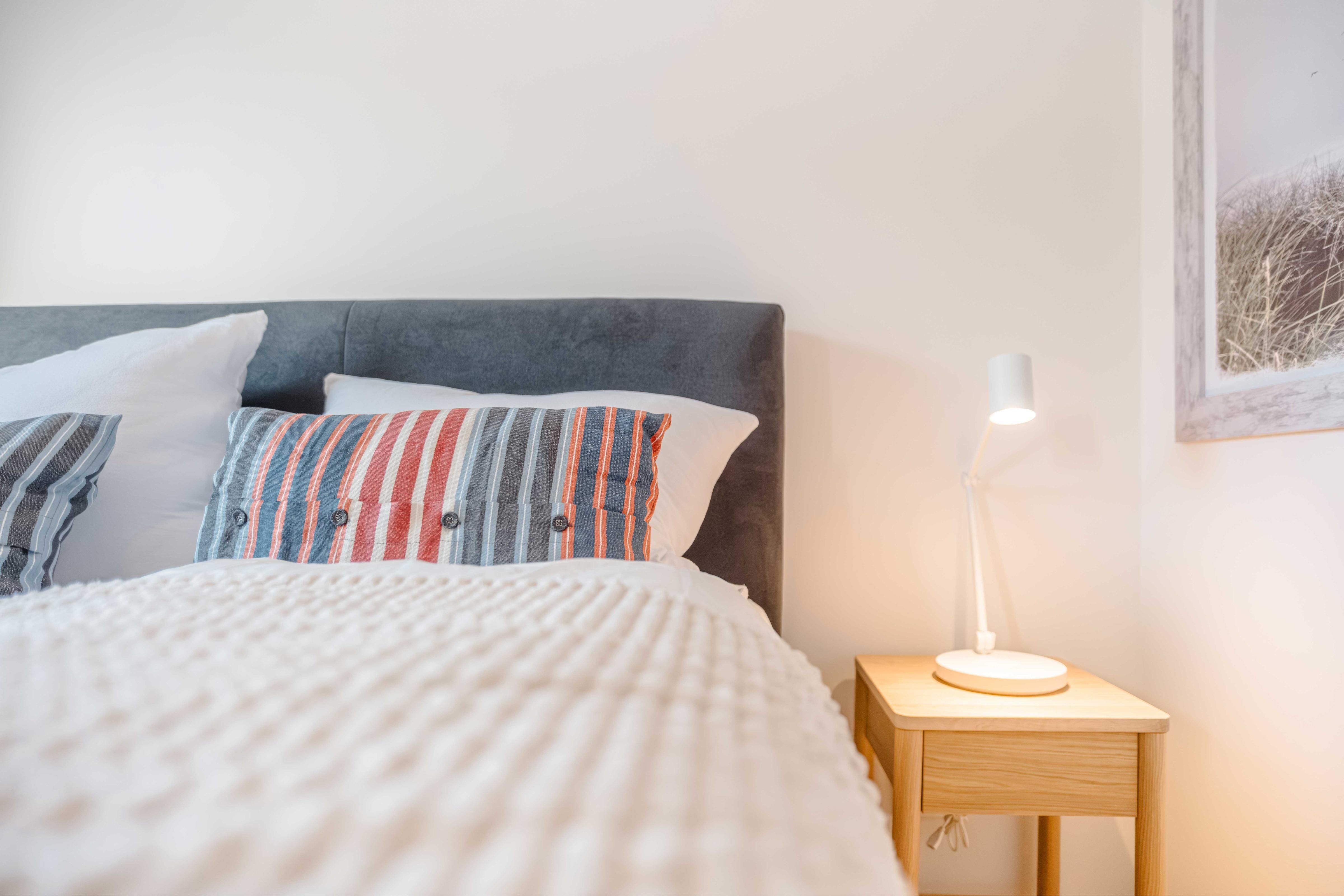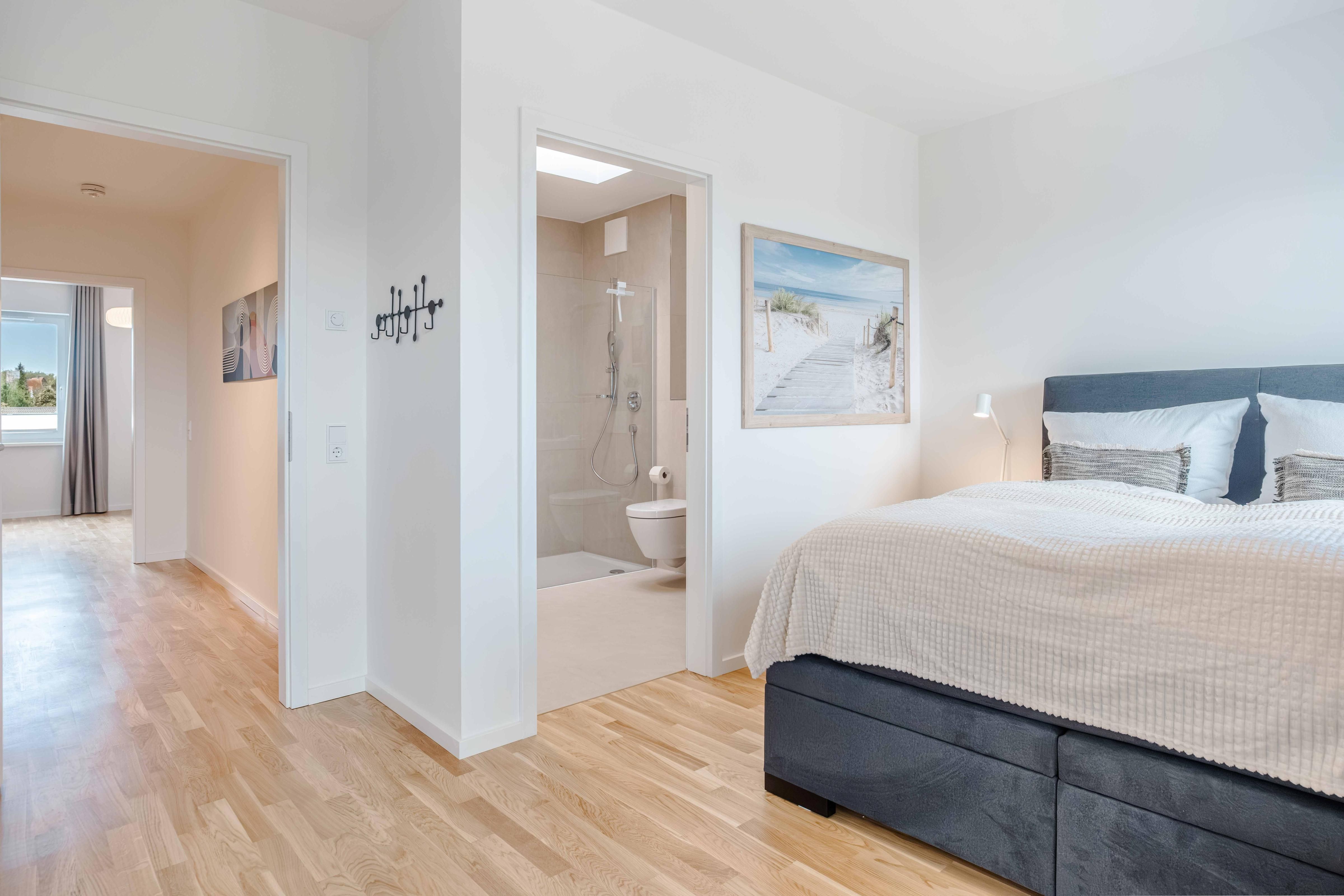 Schlafzimmer 1: Boxspringbett (160x200 cm), offenes Fußende, Kleiderschrank, Verdunklungsmöglichkeit, TV, Bad en Suite, Sessel.