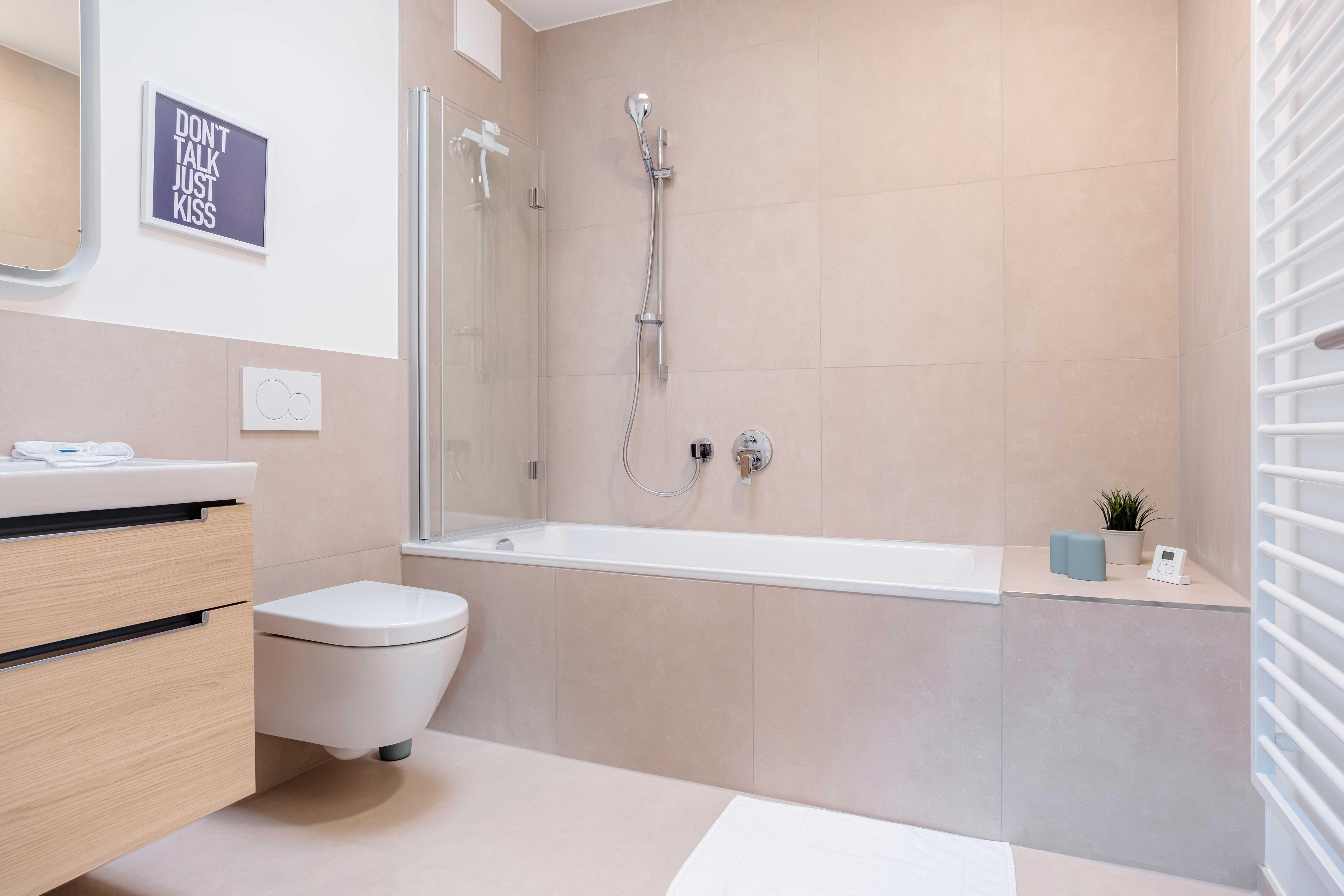 Badezimmer 2: Badewanne mit Abtrennung, WC, Haartrockner, Spiegel, Waschbecken, Oberlicht.
